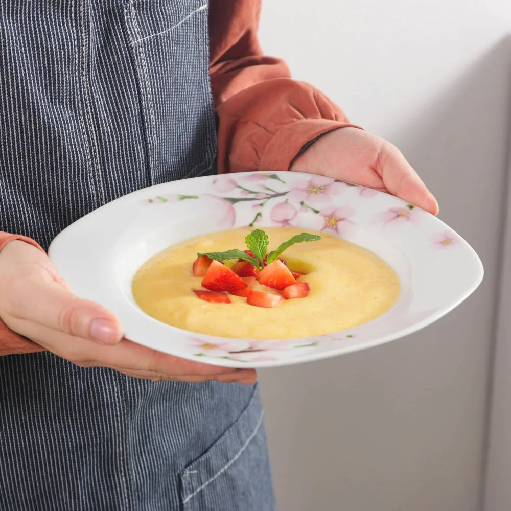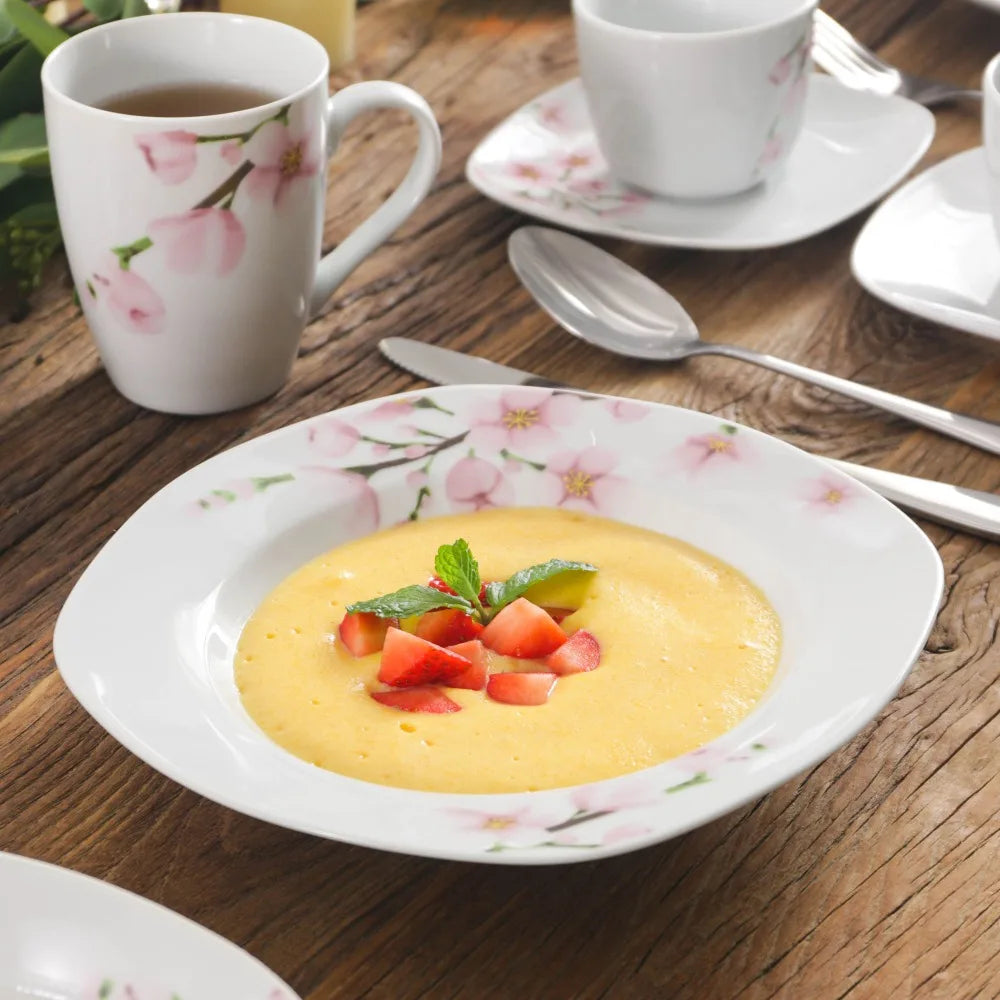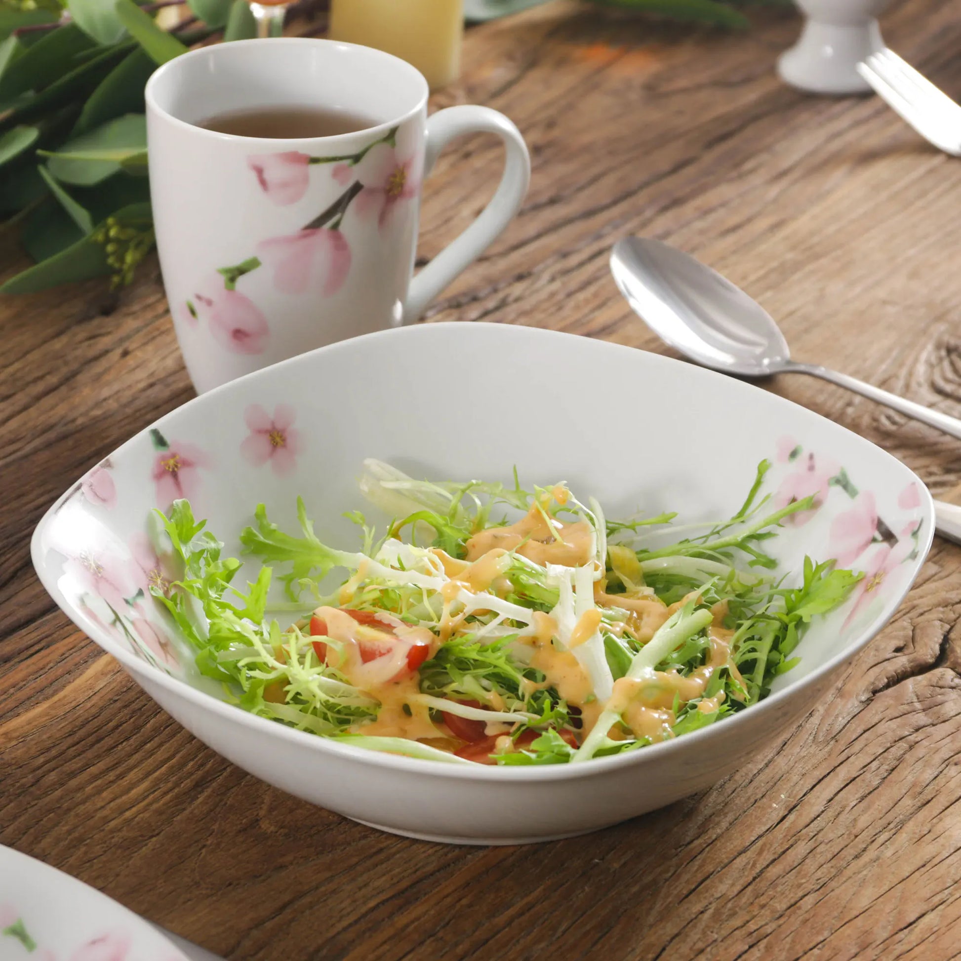 Les courbes douces des assiettes carrées et la délicate finition florale apportent une ambiance chaleureuse et raffinée à chaque repas.