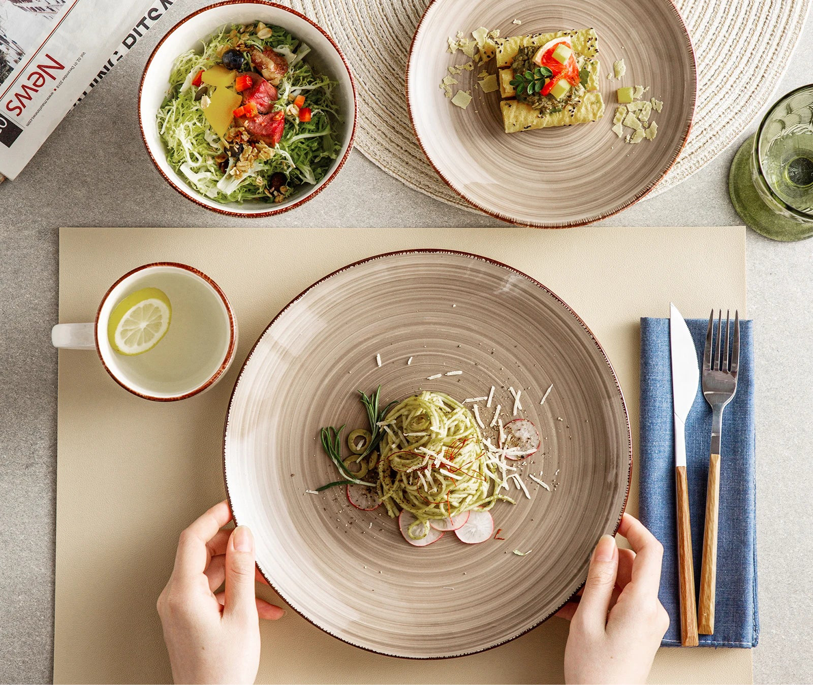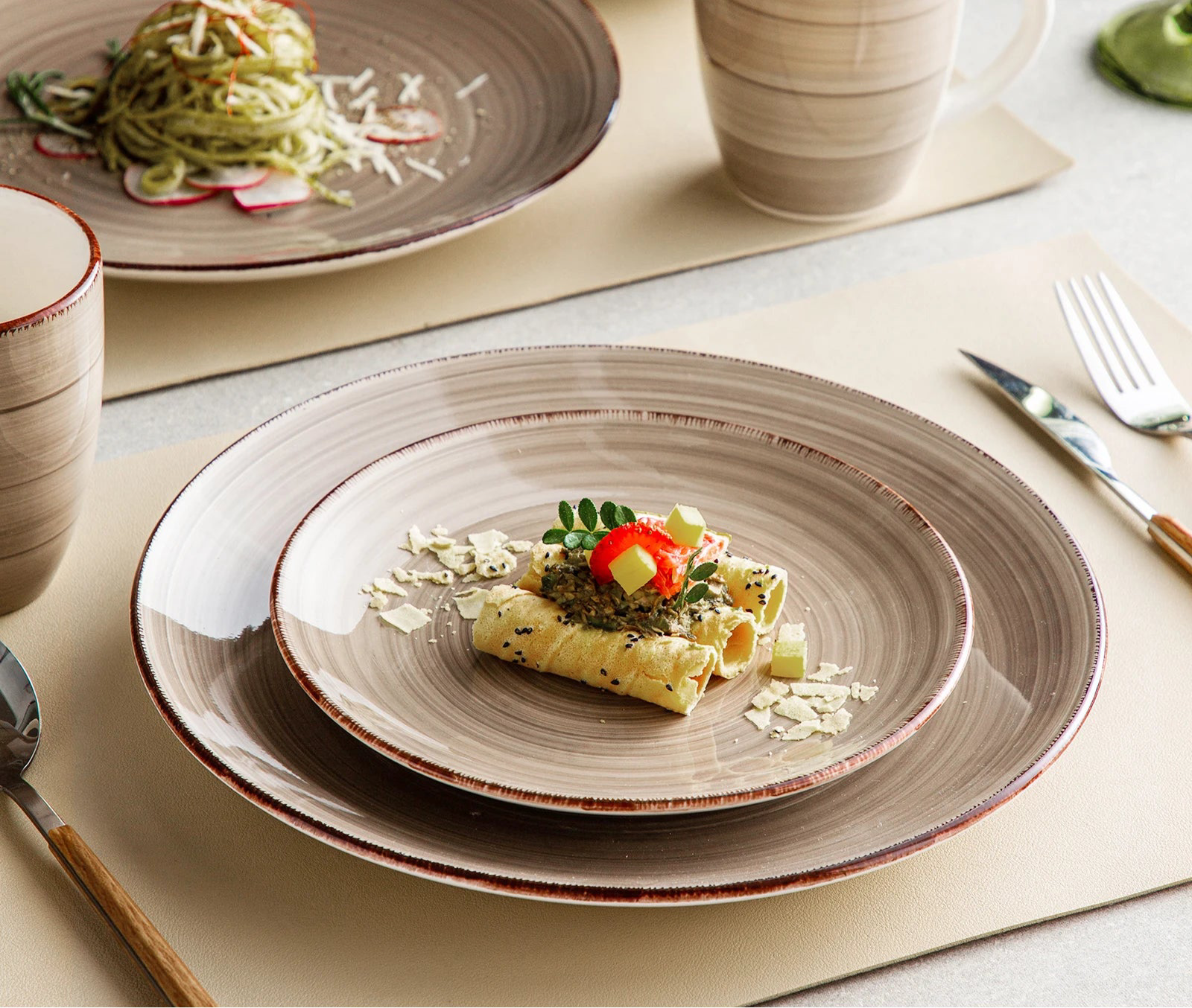 Ses tons naturels et son style artisanal créent une ambiance accueillante et raffinée à chaque repas.