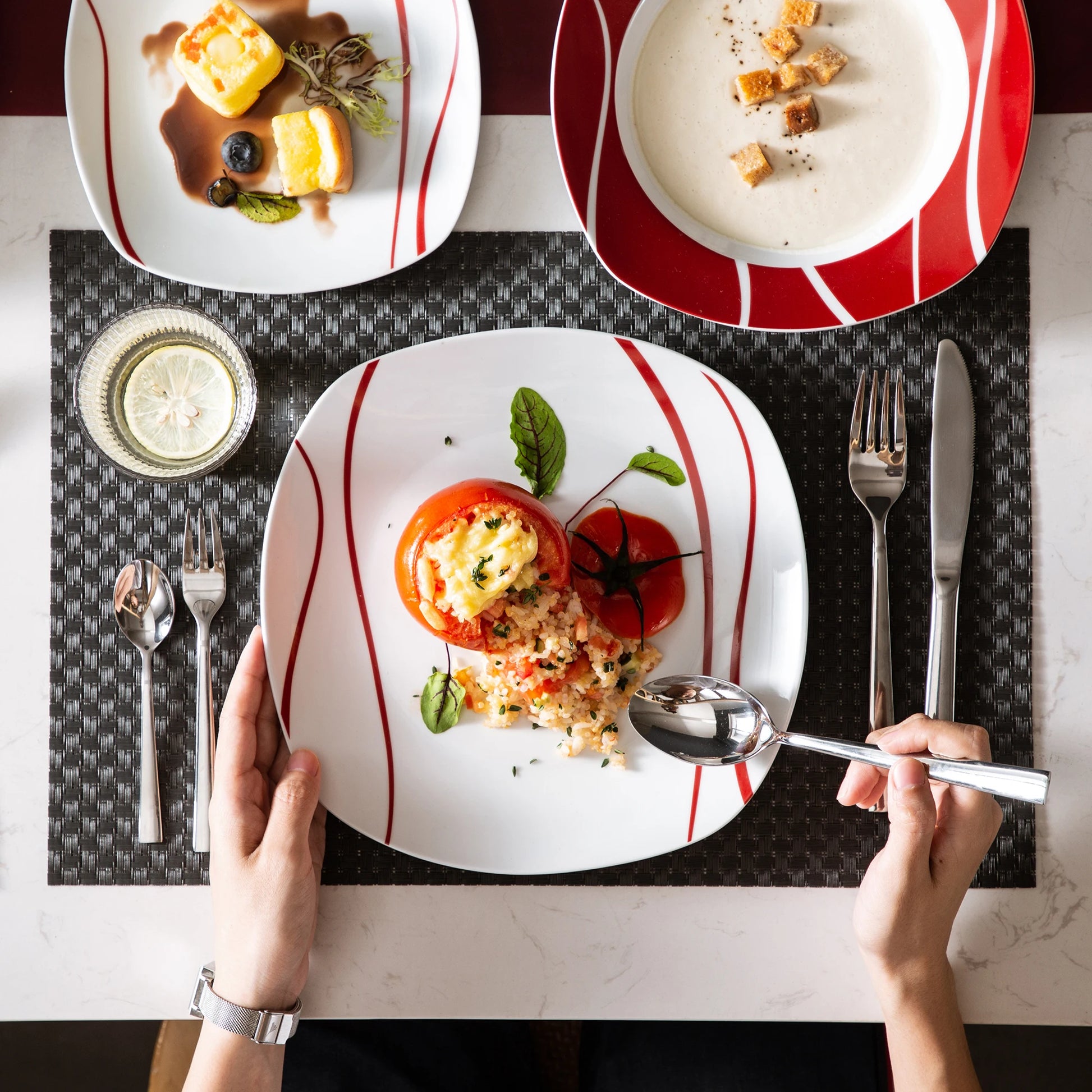Les lignes rouges sur fond blanc apportent une note de vitalité et de sophistication à votre table.