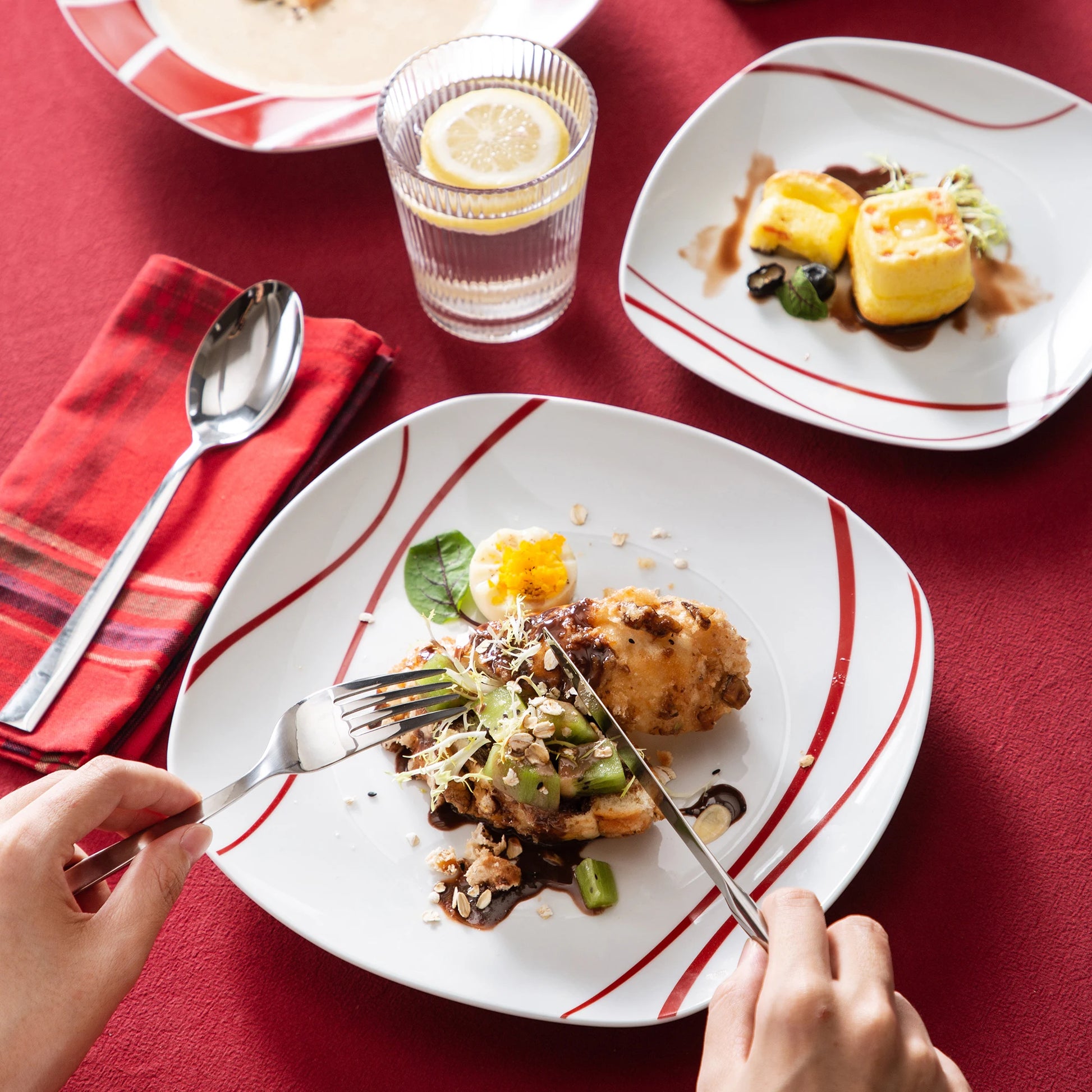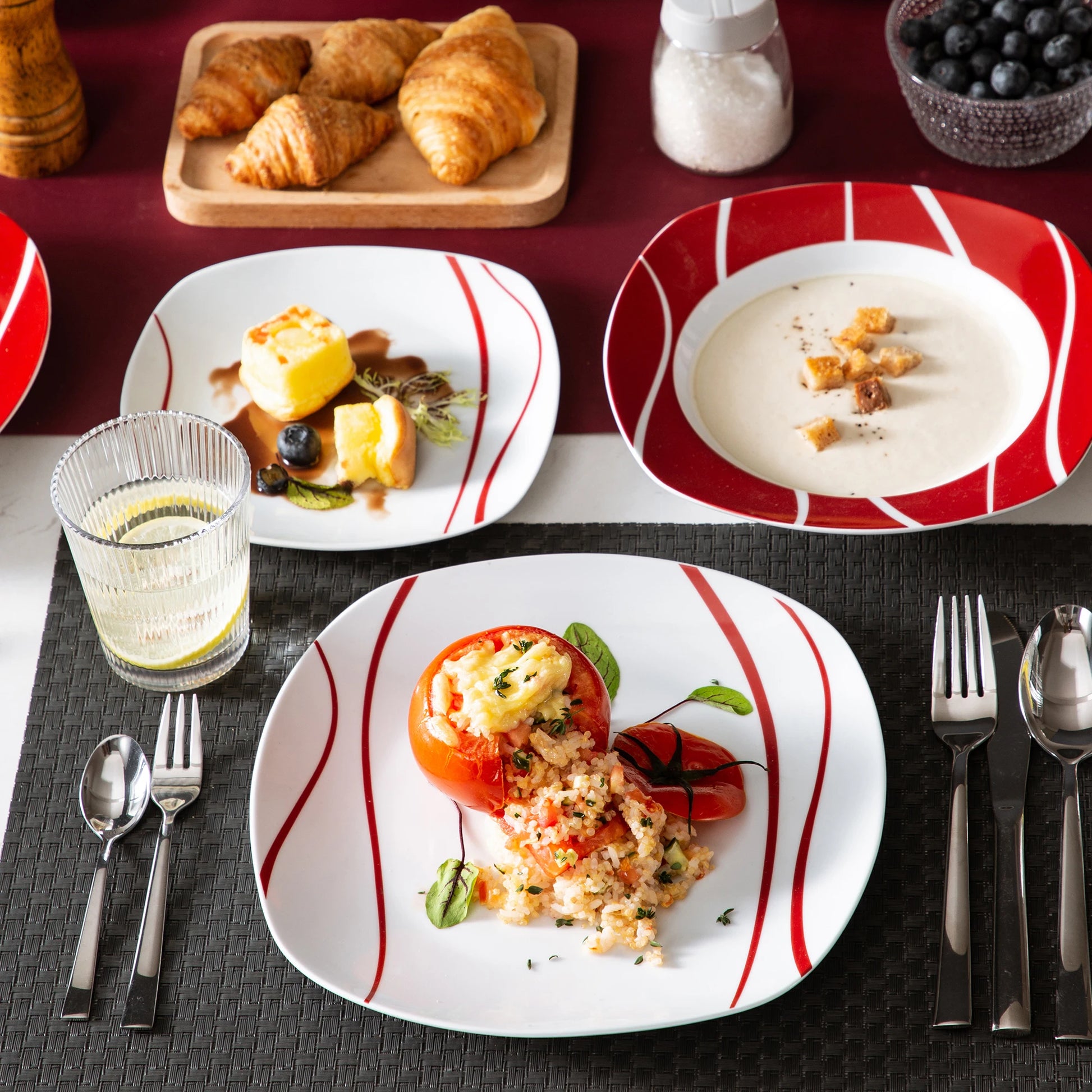 Alliez élégance et dynamisme avec le service de vaisselle FELISA, un ensemble en porcelaine blanche aux lignes rouges fluides et contemporaines.