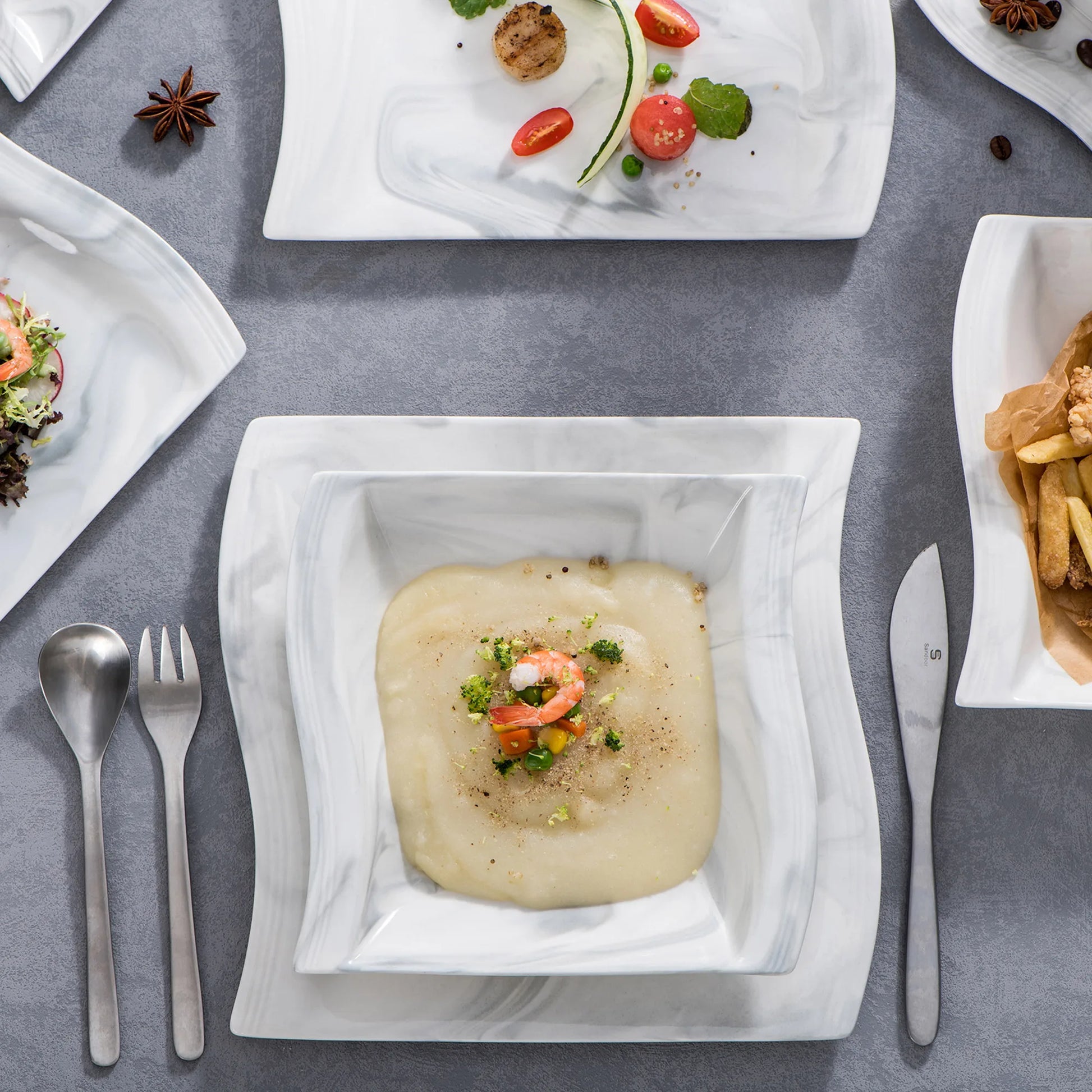 Sublimez vos repas avec le service de vaisselle FLORA, une collection en porcelaine fine au design marbré délicat. Son effet marbre gris perlé et ses formes carrées légèrement ondulées apportent une touche de modernité et de prestige à votre table.