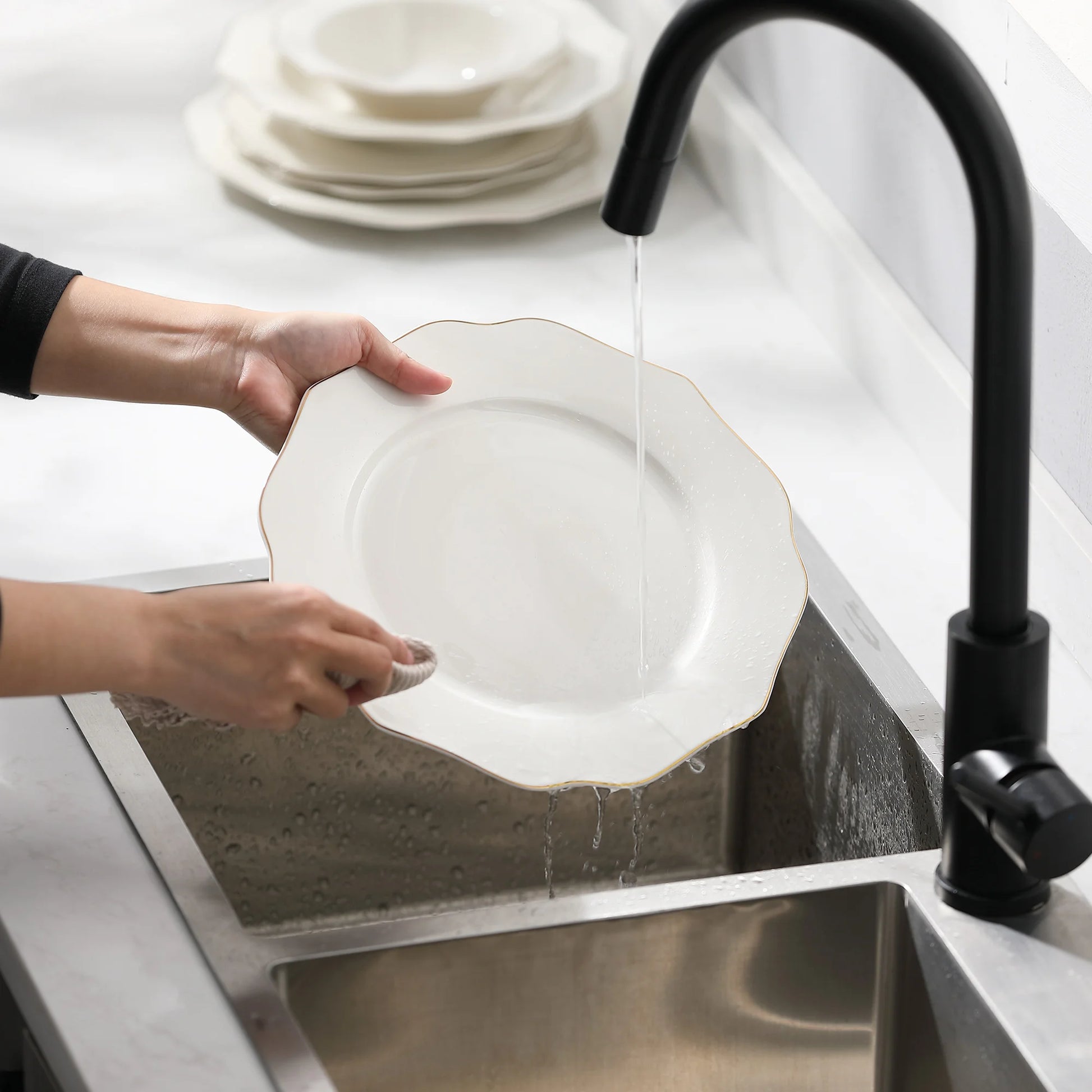 Nos services de vaisselle sont fabriqués à partir de matériaux de haute qualité, ce qui leur confère une bonne résistance aux rayures, notamment contre les couverts. Pour préserver leur éclat, évitez les tampons abrasifs.