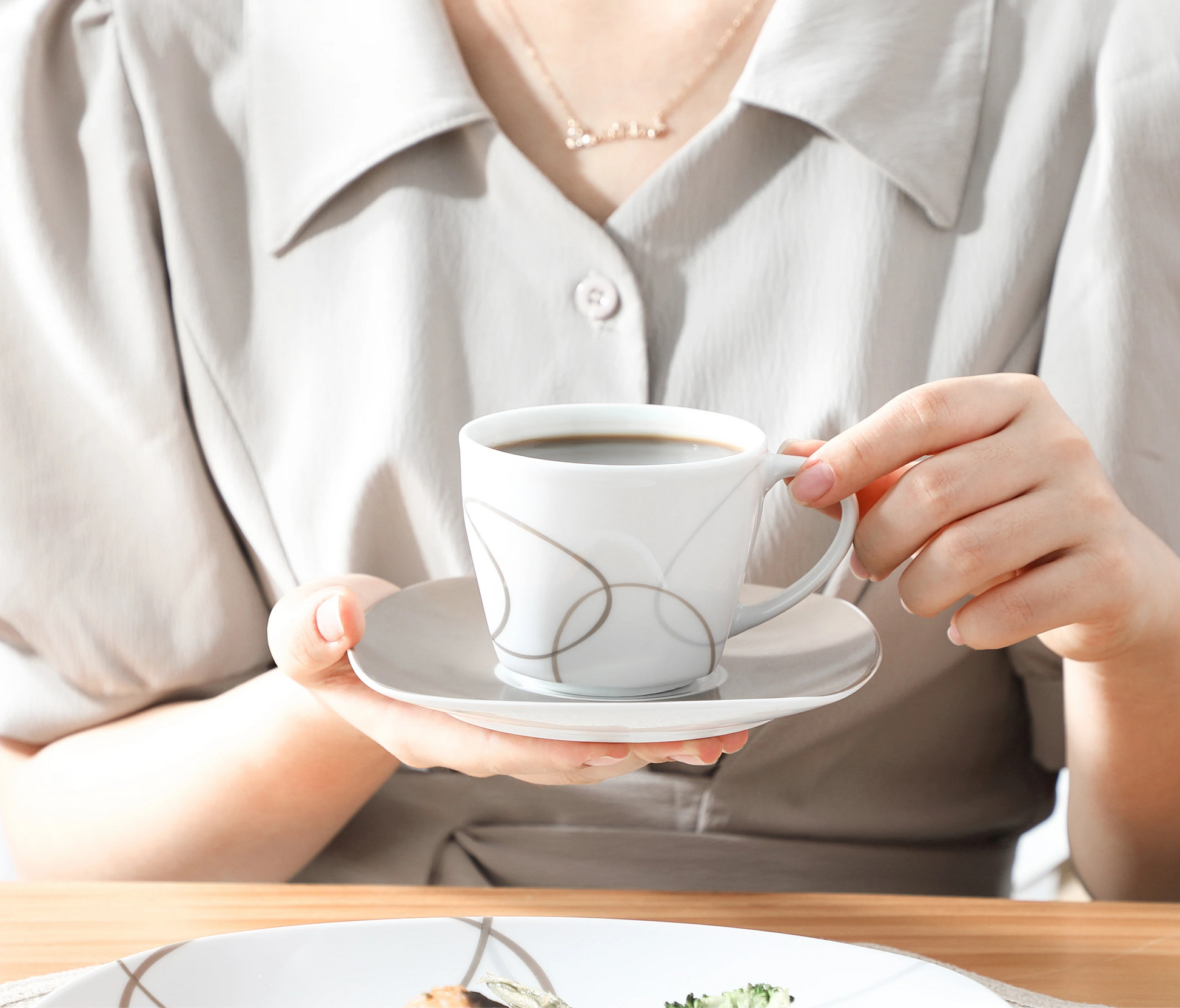 Le service de vaisselle NIKITA allie la finesse de la porcelaine blanche à des motifs entrelacés couleur taupe et beige, apportant une touche de modernité et de douceur à votre table.