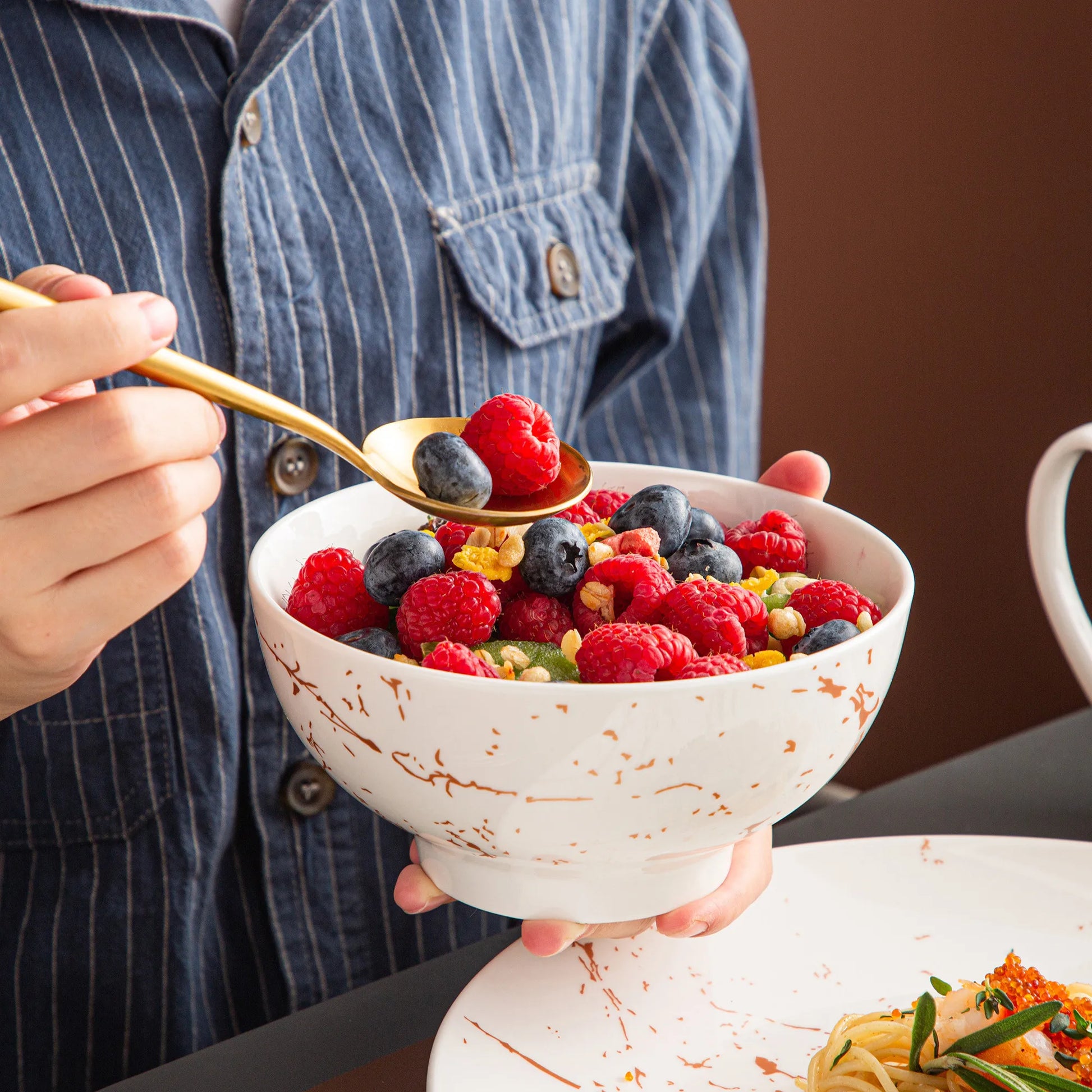 Le service de vaisselle SOFT associe la finesse de la porcelaine blanche à un motif marbré couleur cuivre du plus bel effet.