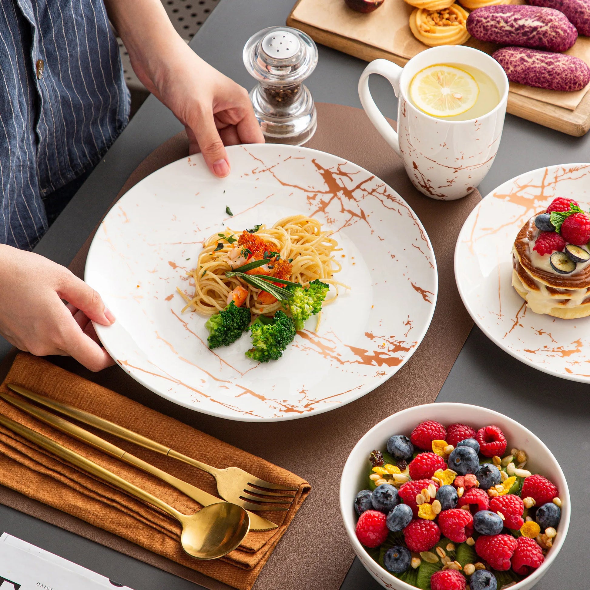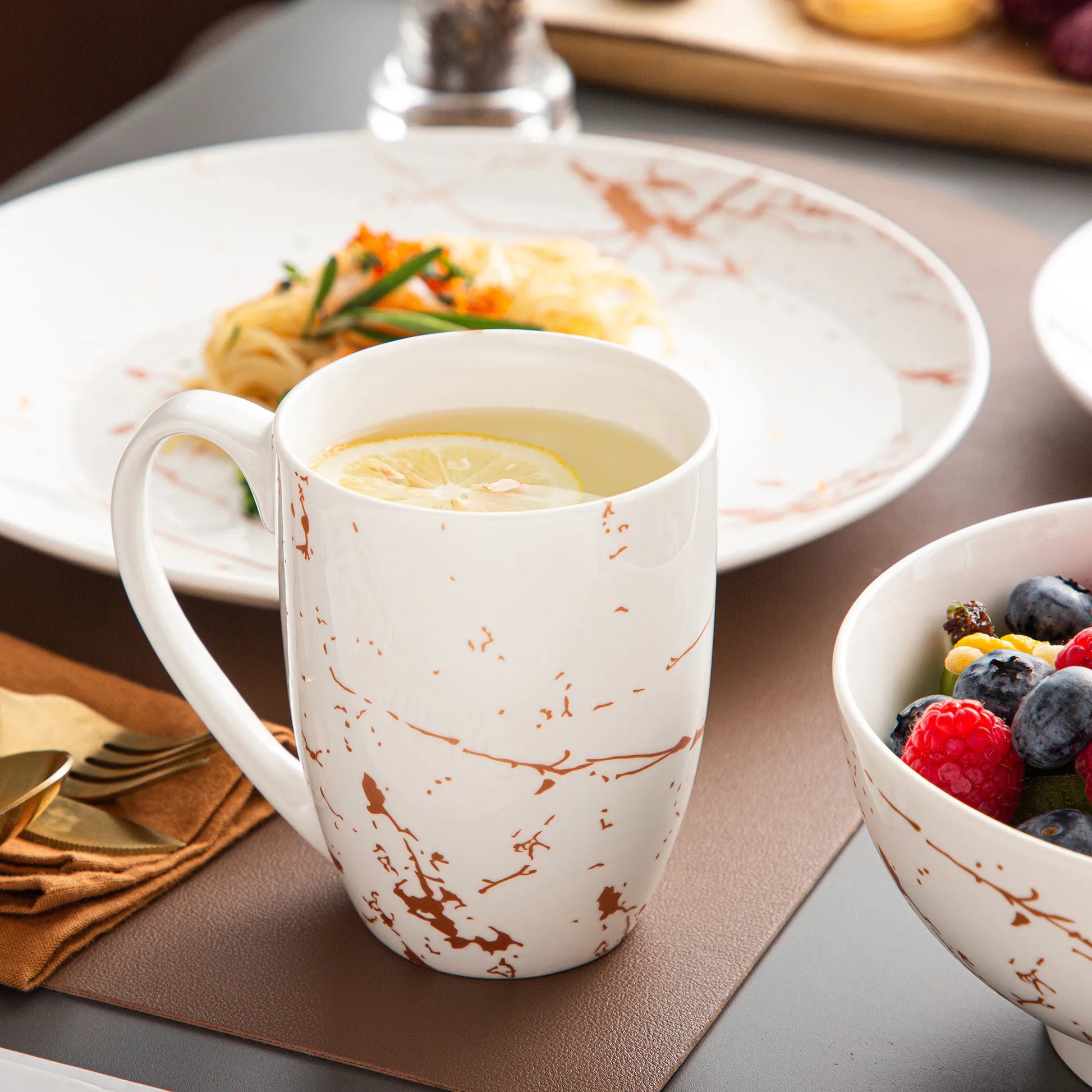 Son design marbré cuivré séduit par son originalité et sa douceur visuelle, tout en restant facile à assortir à tout type de décoration de table.