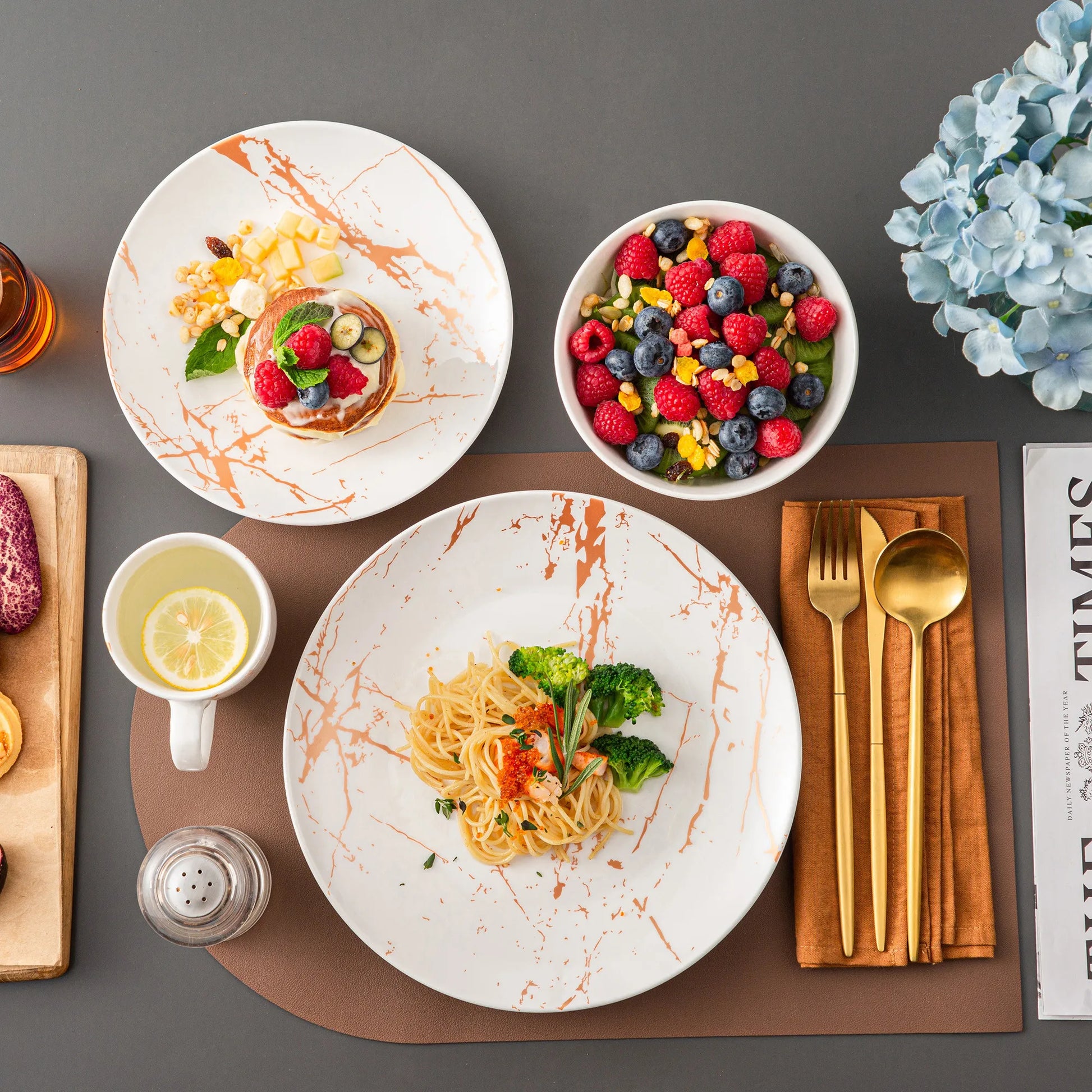 Un design marbré cuivré pour une table moderne et chaleureuse