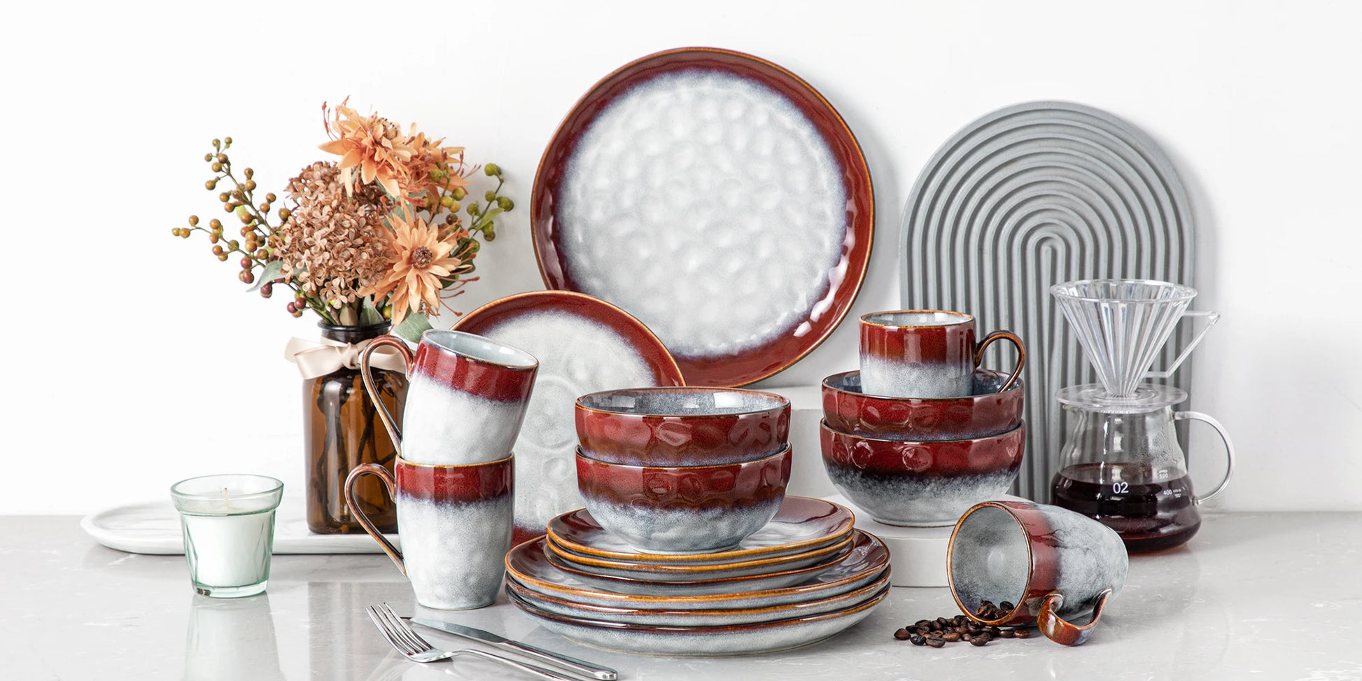Le service STARRY attire le regard avec son design unique mêlant rouge profond et gris perle, pour une table à la fois audacieuse et raffinée.