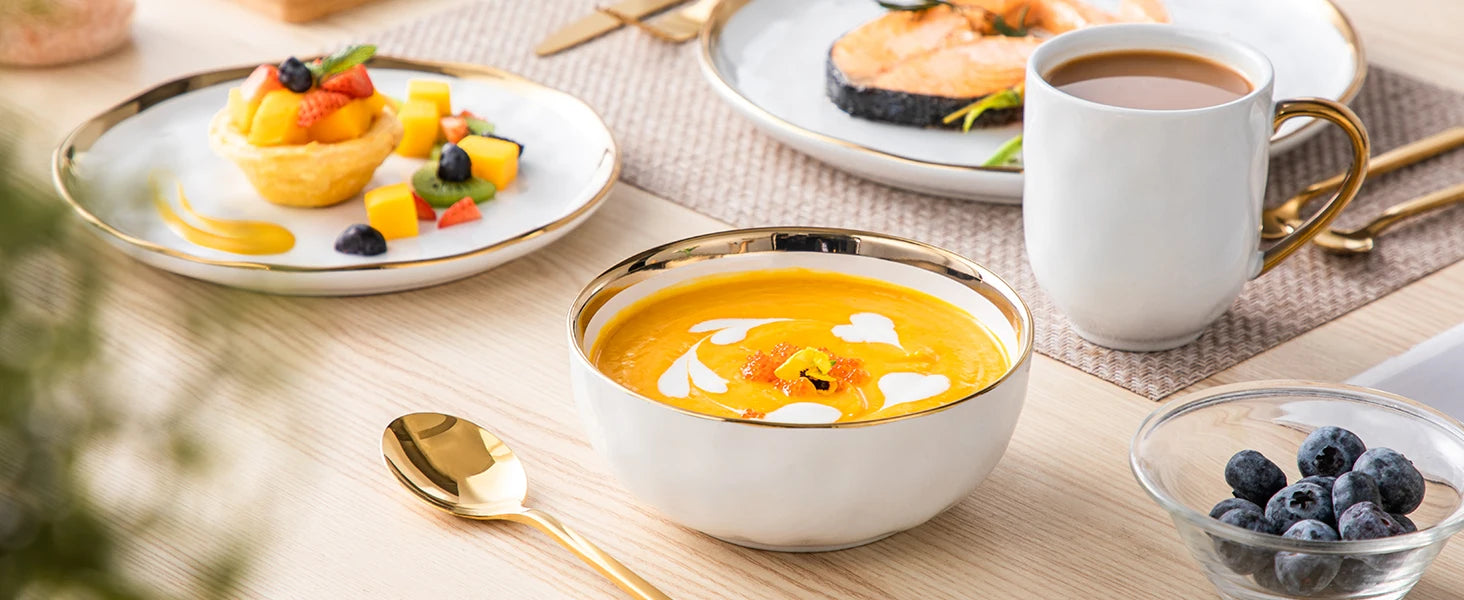 Le contraste entre le blanc pur et les reflets dorés illumine votre table et sublime chaque présentation culinaire.