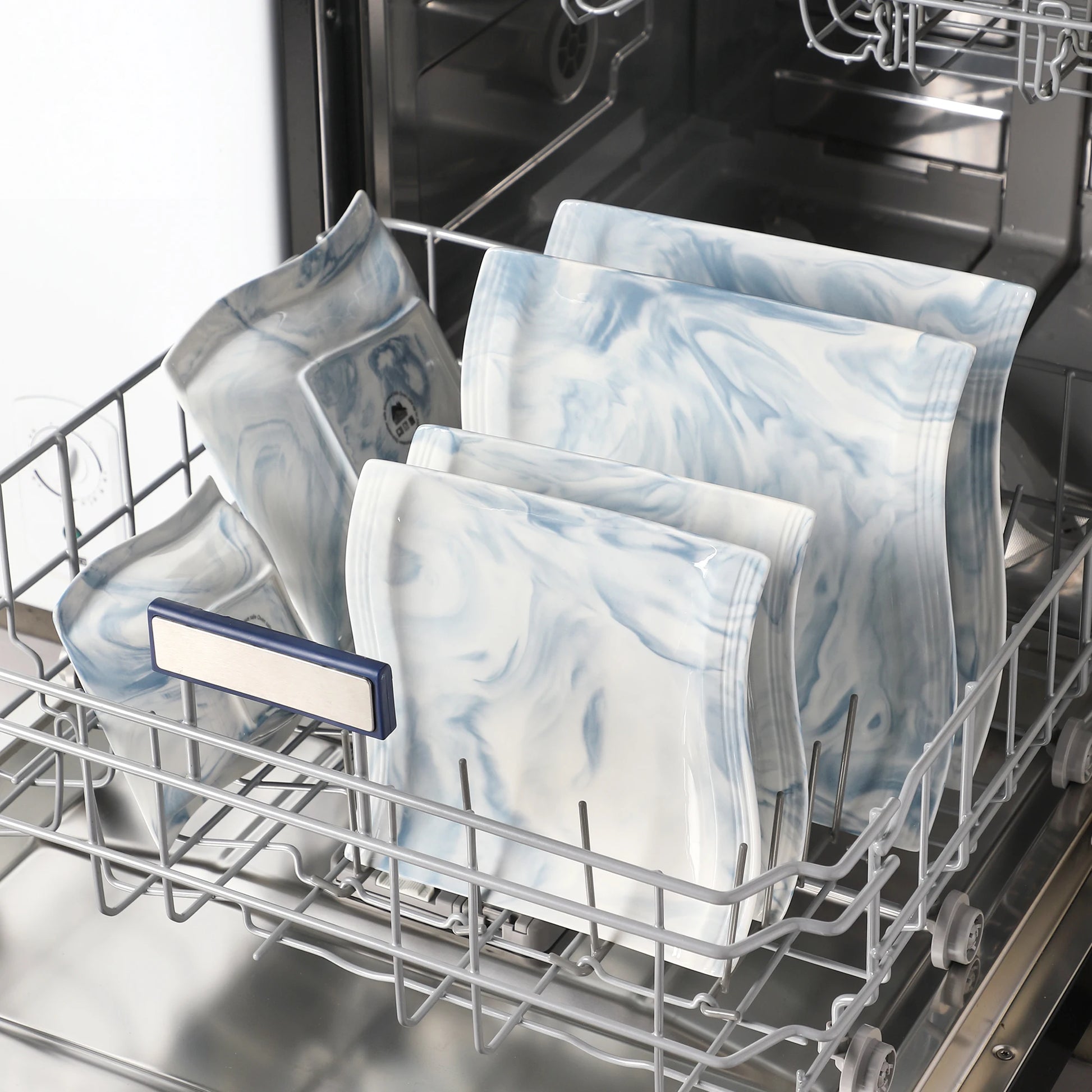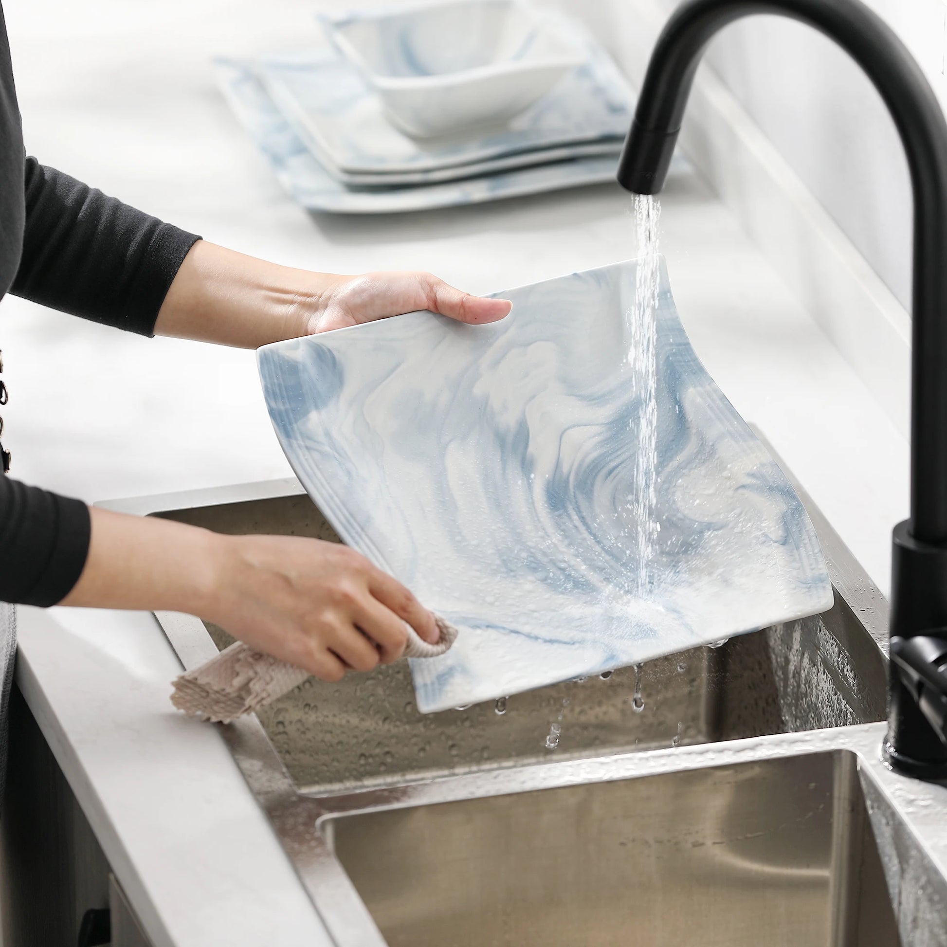 Chaque pièce est ornée d’un motif marbré bleu unique, évoquant la fluidité et la légèreté de l’eau.