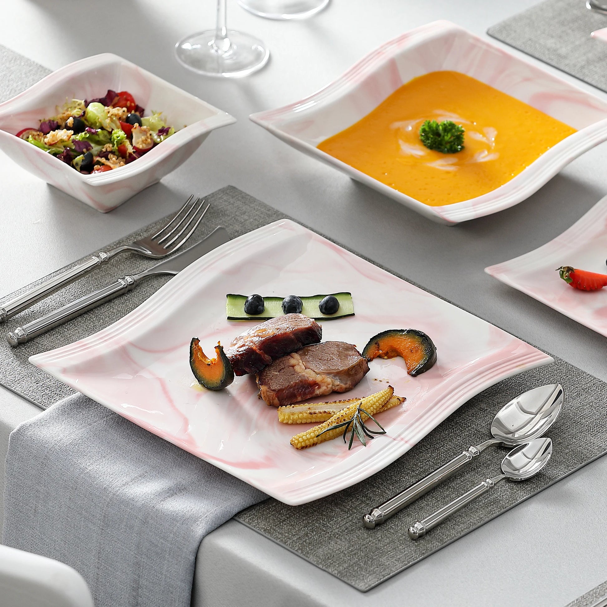 Le service FLORA sublime vos repas grâce à son effet marbre rose délicat et sa forme ondulée sophistiquée.