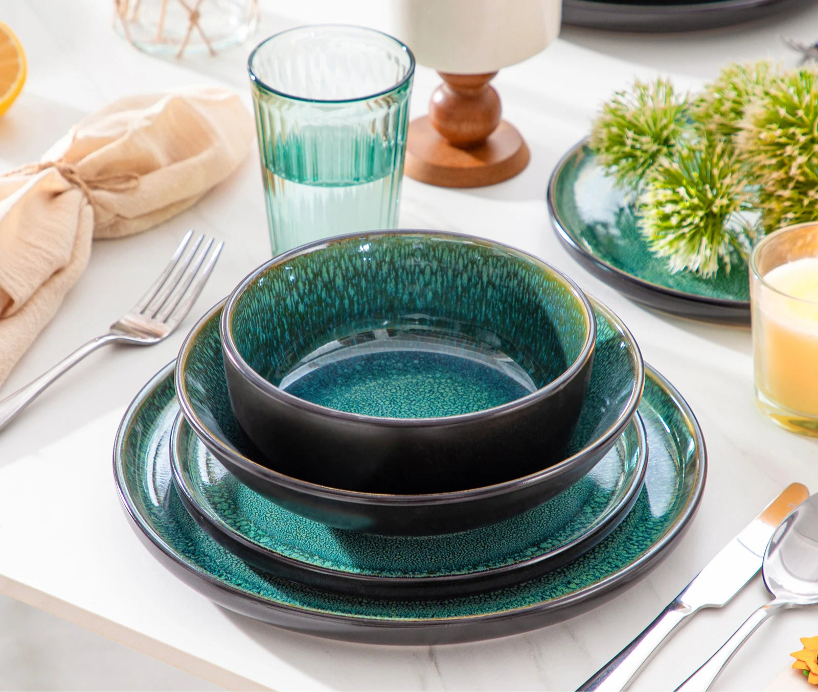Le service GLAZ associe l’intensité du vert-bleu à un rebord sombre et contrasté, pour un rendu moderne et chaleureux.