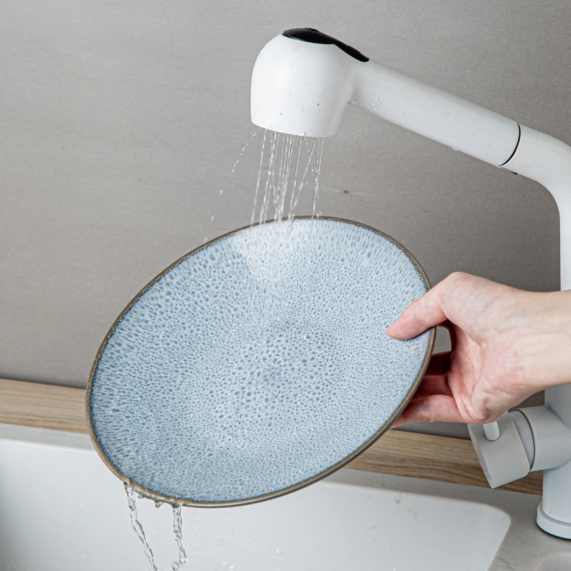 Chaque pièce est travaillée avec une finition émaillée réactive, offrant un effet moucheté raffiné et contemporain.