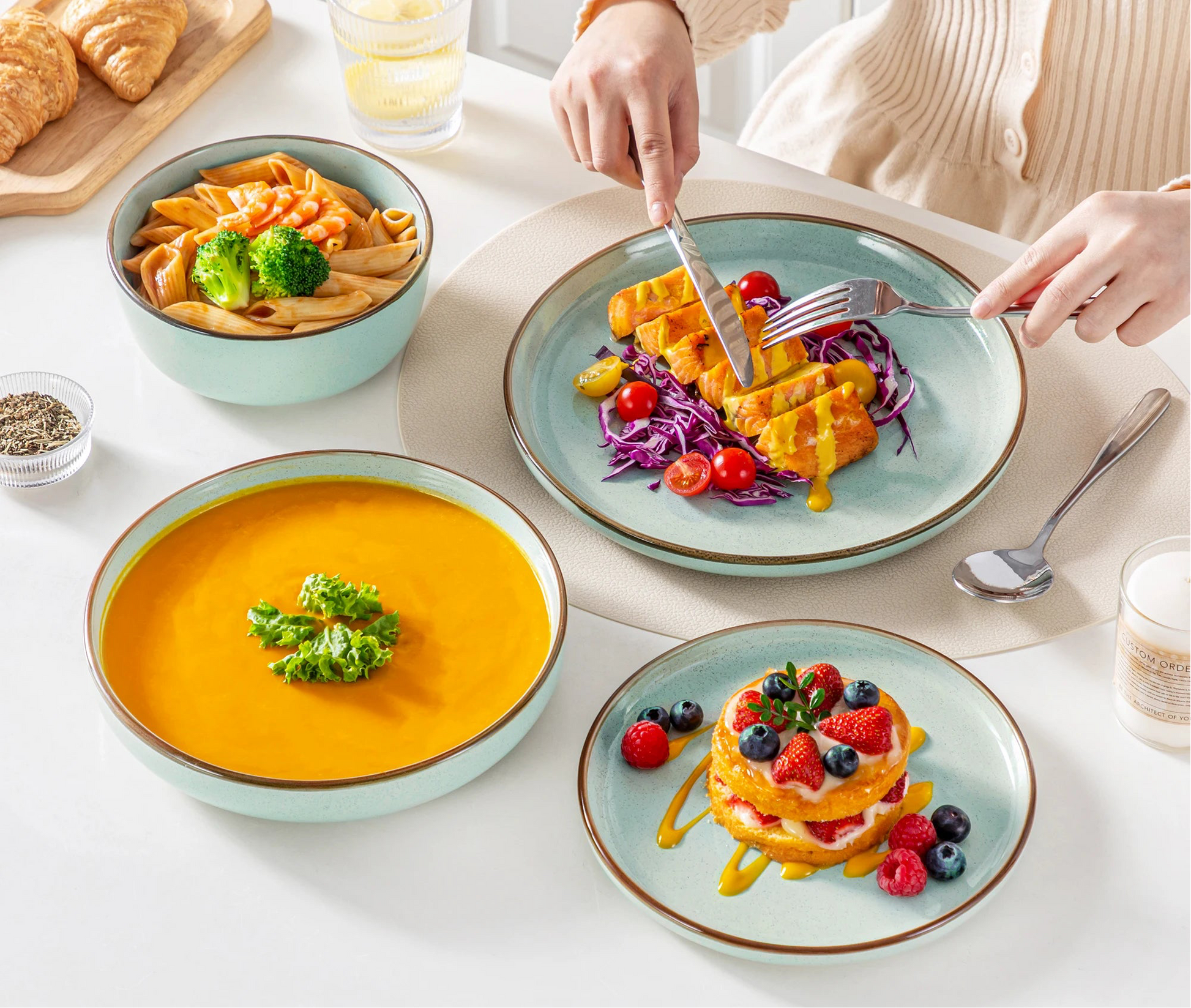 C’est pourquoi nous avons sélectionné des pièces en porcelaine grès et céramique, sans substances nocives, compatibles lave-vaisselle et micro-ondes — pour une expérience aussi pratique que raffinée.