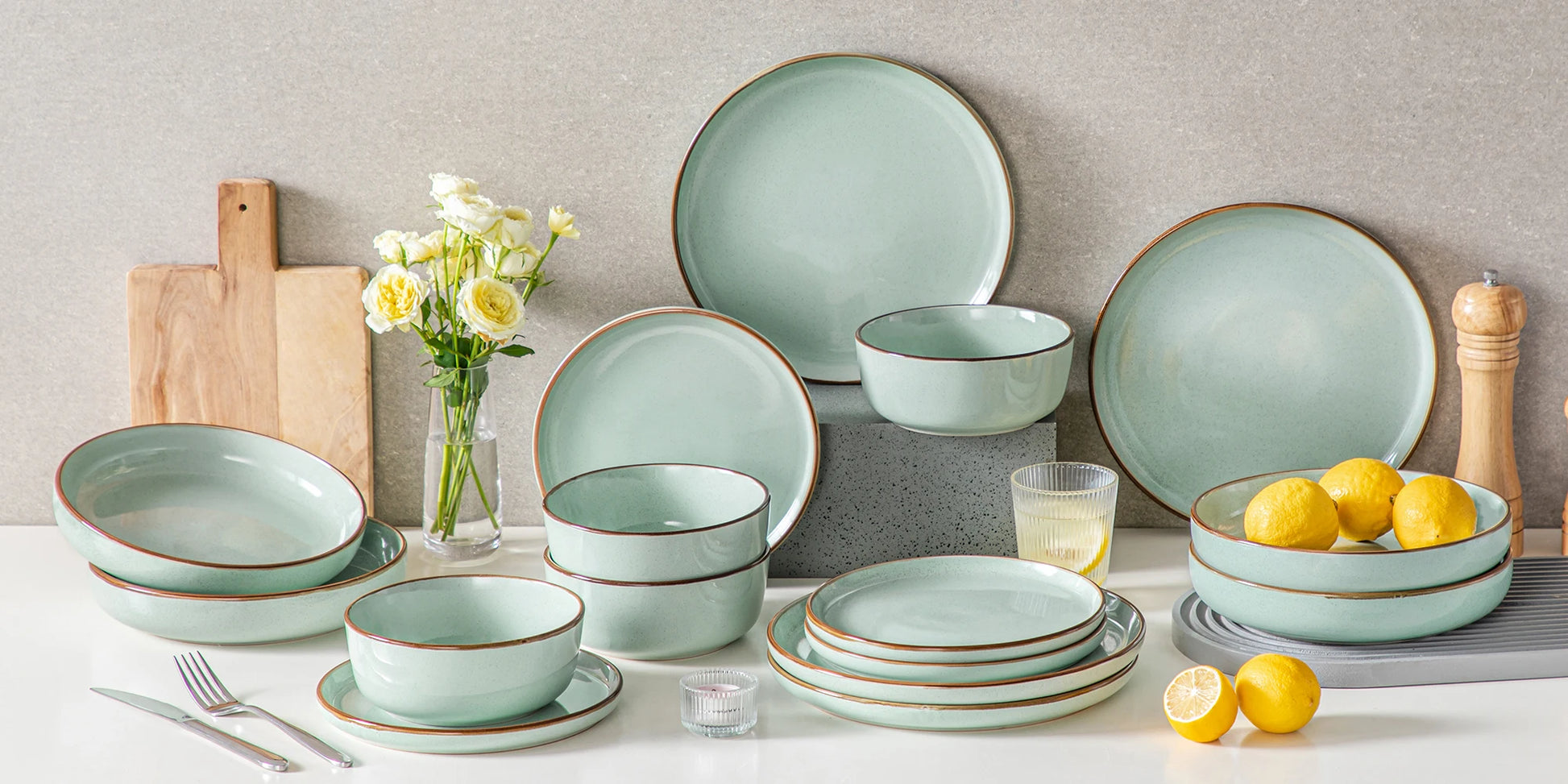 Le service LOIRE séduit par son vert tendre apaisant et ses finitions brunes délicatement contrastées, inspirées des tons de la nature.