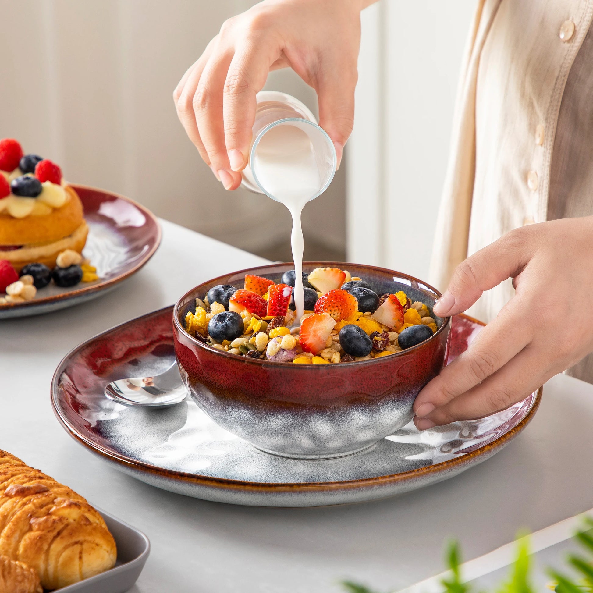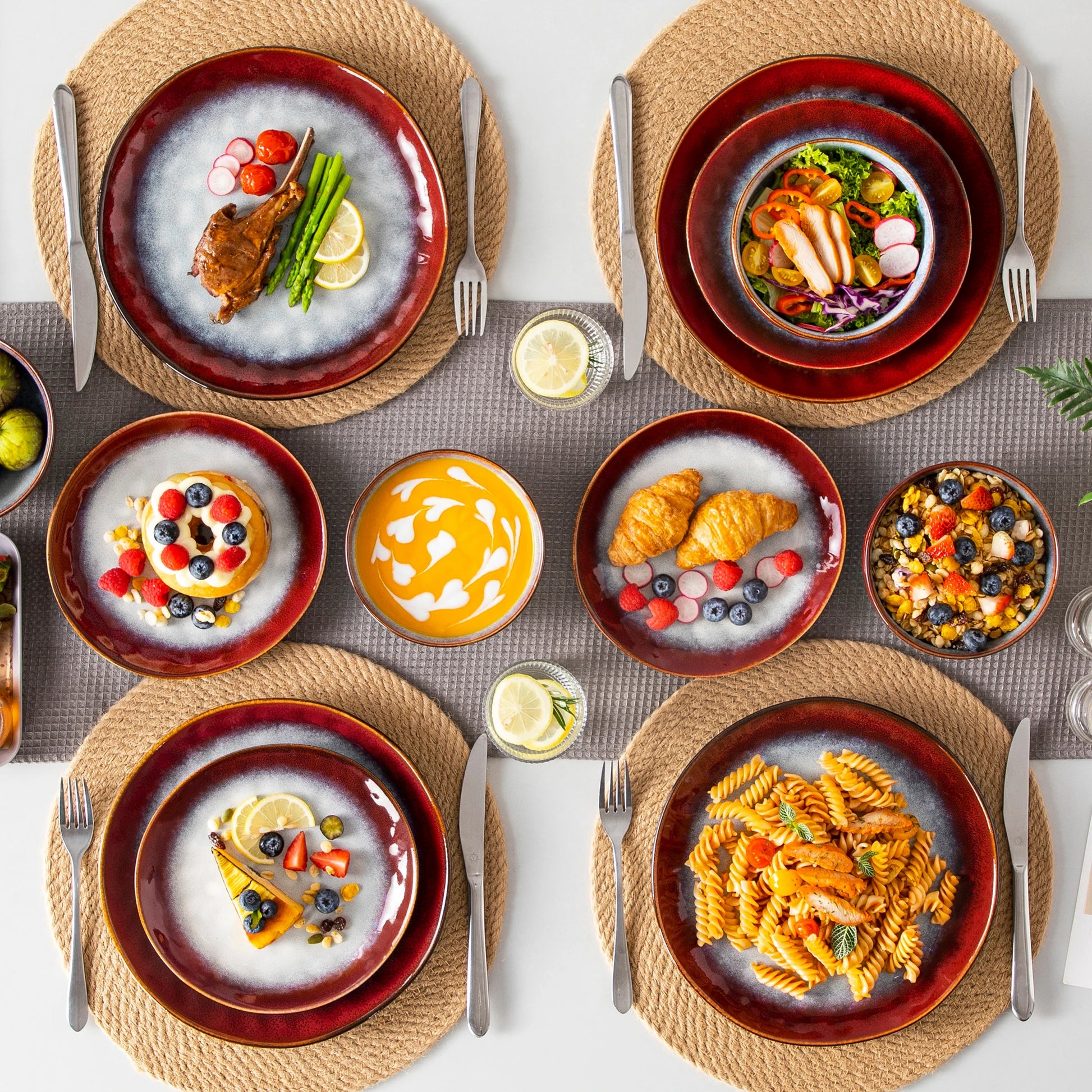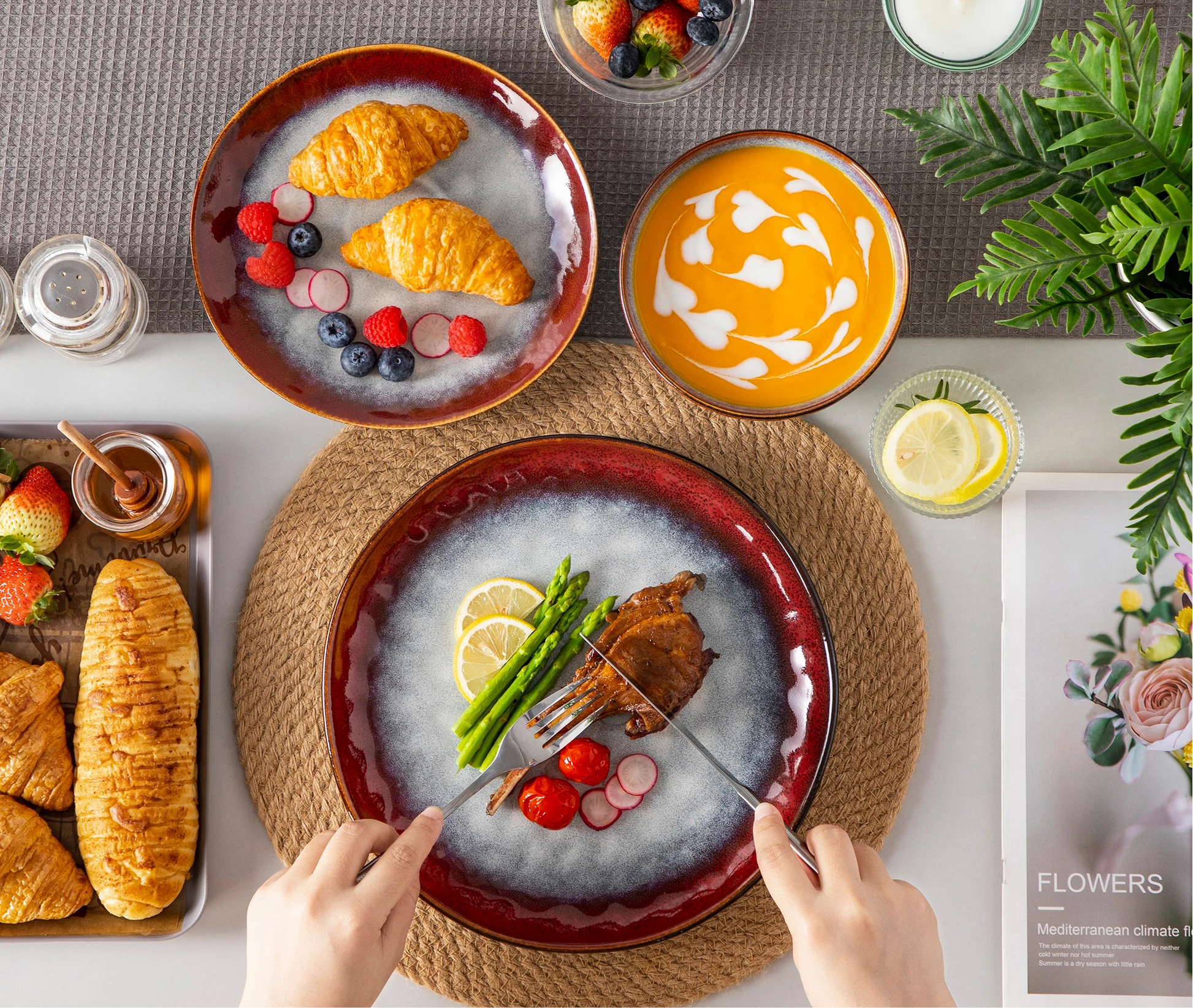 La combinaison du rouge bordeaux brillant et du gris texturé apporte un contraste harmonieux, idéal pour mettre en valeur chaque plat.